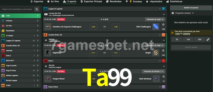 O Ta99 oferece uma grande seleção de opções de apostas em e-sports com probabilidades competitivas